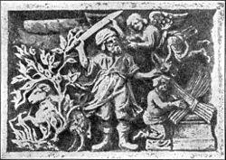 Надгробный памятник с изображением жертвоприношения Исаака на кладбище португальской еврейской общины Амстердама. Jewish Encyclopedia (1901–1906).