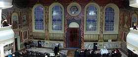 Синагога была рассчитана на 384 сидячих места, главный зал с центральным светильником, который был украшен витражом в форме звезды Давида. На восточной стене — грифоны, держащие скрижали с заповедями, напротив — раскрытая Тора.