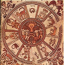 Мозаичная картина на полу изображает еврейские лунные месяцы в их соответствии со знаками зодиака - дань эллинистической традиции.[9][10] Зодиак содержит имена двенадцати знаков на иврите и арамейском. В центре Гелиос, бог солнца, едущий на своей колеснице с четырьмя скакунами. Четыре женщины в углах мозаики представляют четыре времени года.[4]