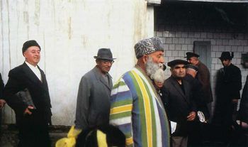 Группа евреев выходит из синагоги. Бухара. 1980-е гг. Из книги М. Наора «Еврейский народ в 20 веке. История в фотографиях», Иер.-Т-А, 2001.