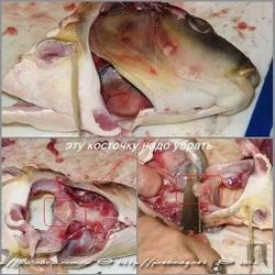 - Карпов почистить и разрезать поперёк: отрезать голову и хвост на длину примерно трети рыбы, остальное разрезать на два равных куска. Съедобные потроха и плавники не выбрасывать. В некоторых рецептах сохраняют даже чешую. Очень важно вырезать и выбросить жабры и нижнюю косточку головы, которые портят вкус отвара.