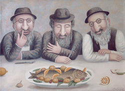 - заполнить пространство между кожей и костями, а также брюшную полость смесью измельченной рыбы, сухарей, яиц, лука с добавлением соли, перца и сахара. Кусочки фаршированной рыбы, сваренные в воде с луком и морковью, подавались холодным с их желеобразным отваром.