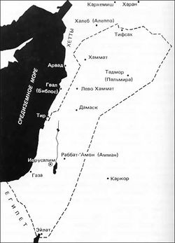 Пределы царства Давида и Соломона (10 в. до н. э.). По библейскому атласу И. АХарони. Издательство «Карта». 1964. Иерусалим.