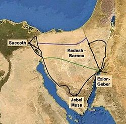 Перейдя Тростниковое море, израильтяне следовали в южном направлении вдоль восточного побережья Суэцкого залива. В этом случае гора Синай должна находиться в южной части Синайской пустыни (Ср. I Ц. 19:8), что соответствует христианской традиции, отождествляющей гору Синай с Джабал-Сирбал, Джабал-Катарина или Джабал-Муса. От горы Синай израильтяне повернули на север к Кадеш-Барнеа (возможно, через Эцион-Гевер).