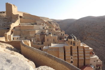 Монастырь огромен, у него голубые купола и узкие ворота на случай нападения. Женщин и животных женского пола в монастырь не пускают. В монастыре две пещеры - в одной мощи св. Саввы, умершего в 532 году, а в другой черепа монахов, погибших от рук персов в 614 году.