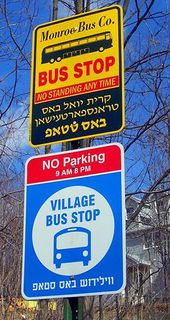 Автобусная остановка в Кирьяс-Джоэль (штат Нью-Йорк). Английские слова написаны еврейскими буквами. Фото Дэниэла Кейса.