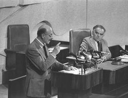 Глава правительства Д. Бен-Гурион, выступая в Кнесете 20 февраля 1950 г., в свою очередь, утверждал, что опасности, подстерегающие формирующуюся демократию, «реальны в государстве, имеющем конституцию, в такой же степени, как в государстве, конституцией не обладающем». Выступая против принятия конституции, депутат Кнесета Д. Бар-Рав-Хай утверждал, что сохранение принципов закона и демократии зависит не от конституции, а от «сознания и уровня политической культуры народа»; в качестве примера противники конституции говорили об огромных различиях между законами и практикой при диктаторских режимах, существовавших в середине 20 в. в Германии и в России.