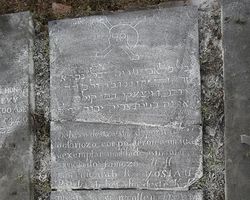 | И возлег Давид с праотцами своими. Памятник захоронения старца прославленного, знатного, доблестного и трудолюбивого человека, oбщиннoгo лидерa Давидa, сын Яакова га-Когена Наси, которого Бог взял с добрым именем в свой мир, по возвращении его после усмирения восставших рабов-африканцев 19 числа месяца кислева, год 5547 (1787) [или 5503 (1743)]. |