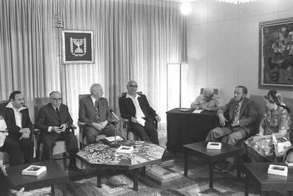 Представители Национально-религиозной партии на приеме у президента Израиля Э. Кацира вскоре после выборов в Кнесет девятого созыва. 1977 г. Фото С. Яакова. Государственное бюро печати. Израиль.