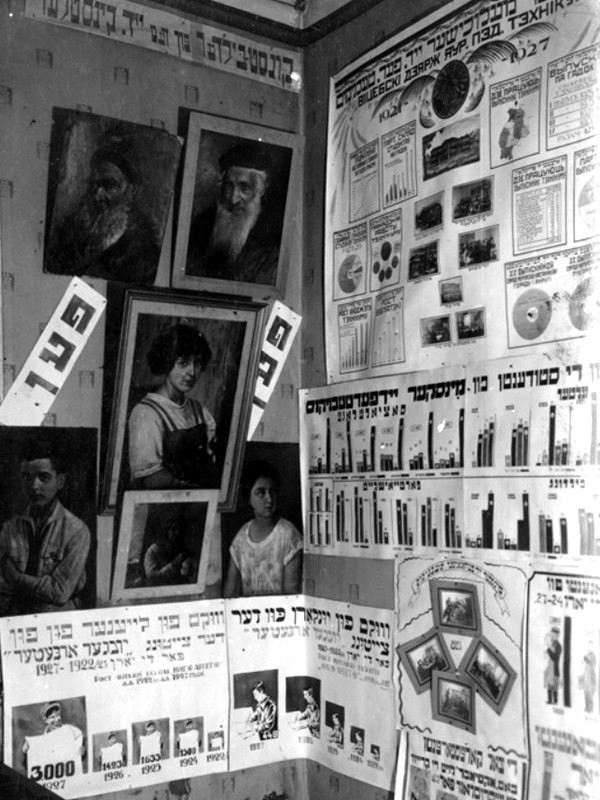 Выставка национальных меньшинств БССР к 10-летию Октябрьской революции. Еврейский павильон. Экспонаты еврейских педагогических техникумов и работы еврейского художника И. Пэна. 1927. Фото: Архив «ОРТ–Фарбанд. 1920–30-е гг.».