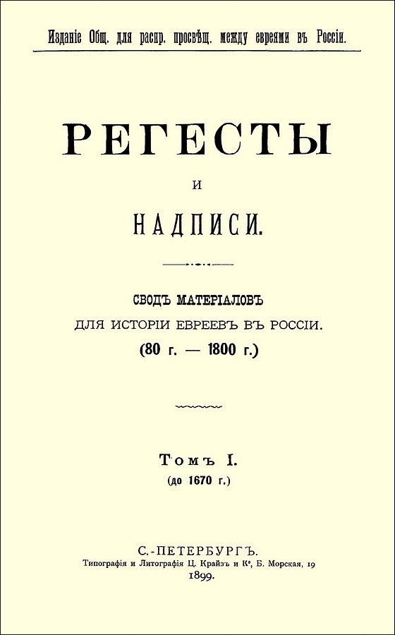 Титульный лист издания «Регесты и надписи. Свод материалов для истории евреев в России». Вып. 1., Санкт-Петербург, 1897 г.