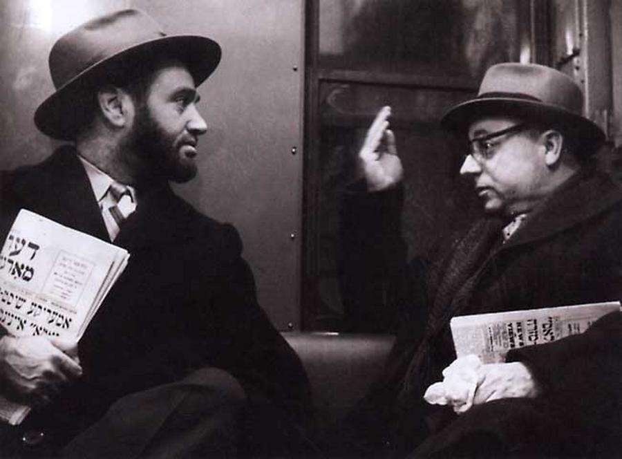 Газеты на идиш в руках пассажиров нью-йоркского метрополитена. 1930-е годы. Из книги М. Наора «Еврейский народ в 20 веке. История в фотографиях», Иер.–Т.-А., 2001.