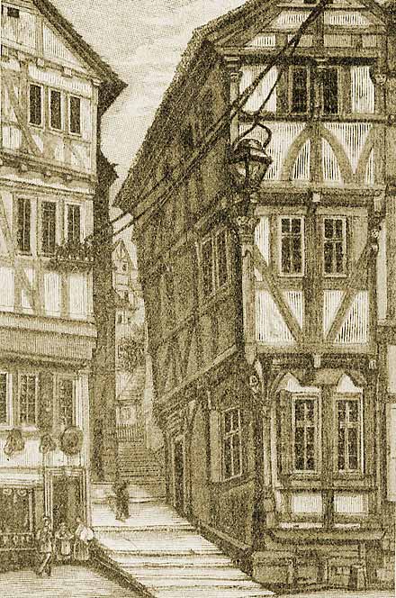 Еврейская улица в Марбурге. Гравюра Дж. А. Коха. Jewish Encyclopedia (1901–1906).