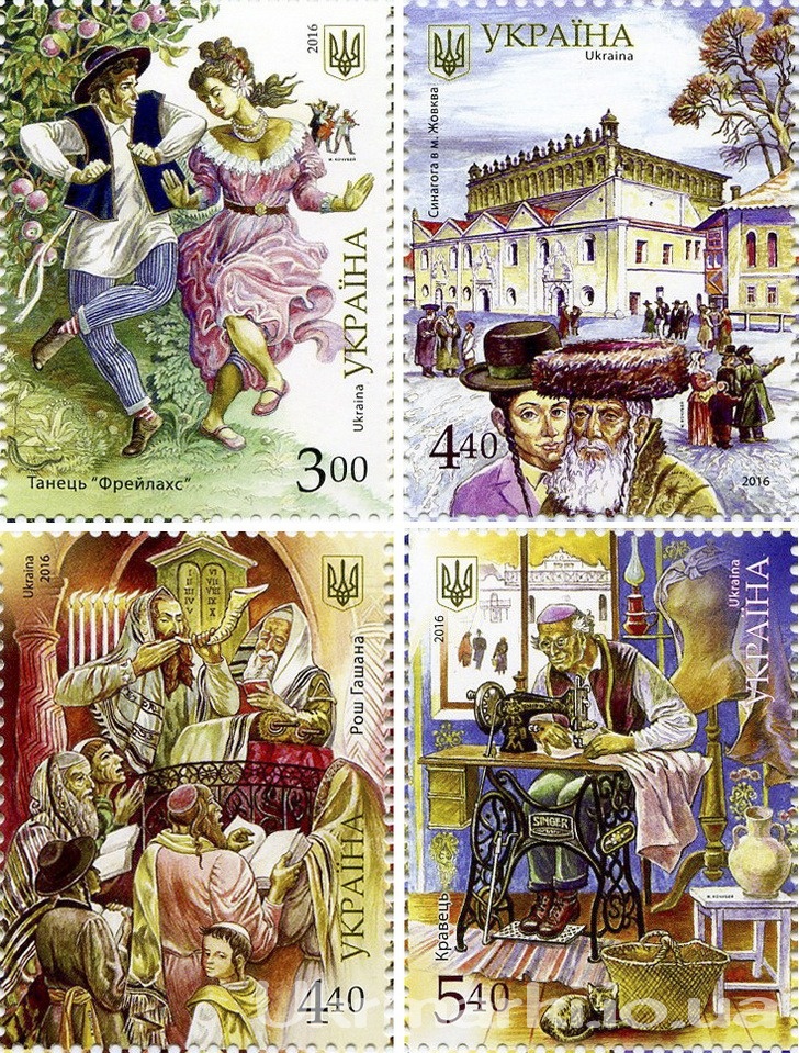 Марки еврейской тематики из серии «Национальные меньшинства Украины»: «Танец “Фрейлахс”», «Синагога в г. Жовква», «Рош ха-Шана» и «Портной». Художник Н. Кочубей. Почта Украины. 2016.