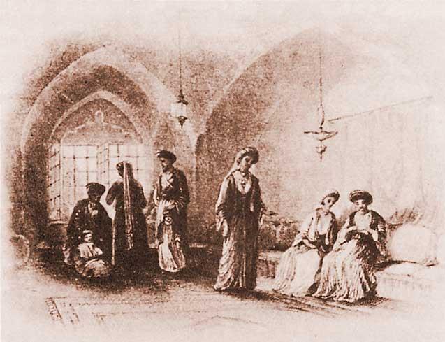 Интерьер жилища сефардской семьи на горе Сион. Гравюра из книги У. Бартлетта «Прогулки по Иерусалиму и его окрестностям». Лондон. 1844.