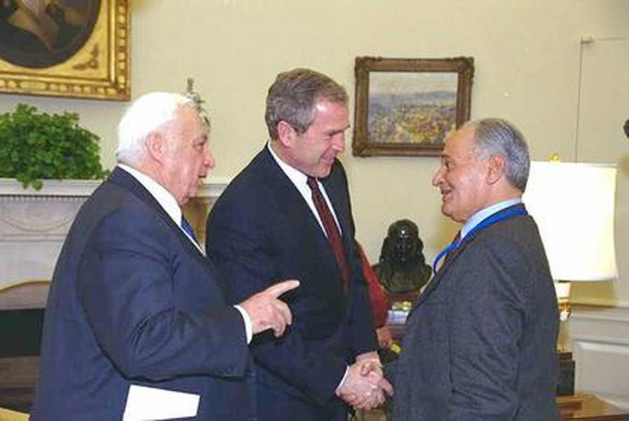 Премьер-министр Израиля А. Шарон представляет президенту США Д. Бушу журналиста У. Дана (2001 г.). Фото Я. Са‘ара. Государственное бюро печати. Израиль.