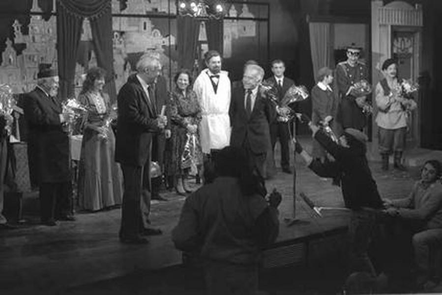 Премьер-министр Израиля И. Шамир и мэр Тель-Авива Ш. Лахат с актерами театра на идиш. Тель-Авив, 1988 г. Фото М. Аялон. Государственное бюро печати. Израиль.