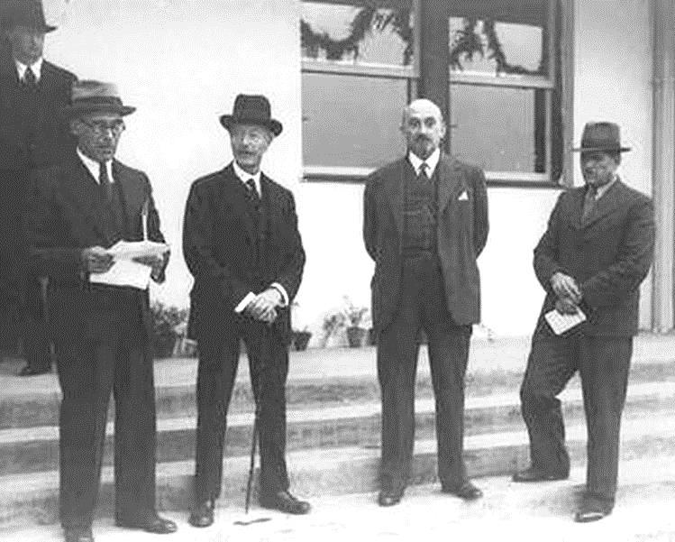 А. Волкани (крайний слева) зачитывает обращение на открытии экспериментальной сельскохозяйственной станции (Реховот) при Еврейском университете в Иерусалиме; справа: британский верховный комиссар сэр Артур Уокоп и Х. Вейцман. 1935 г. Фото З. Клугера. Государственное бюро печати. Израиль.
