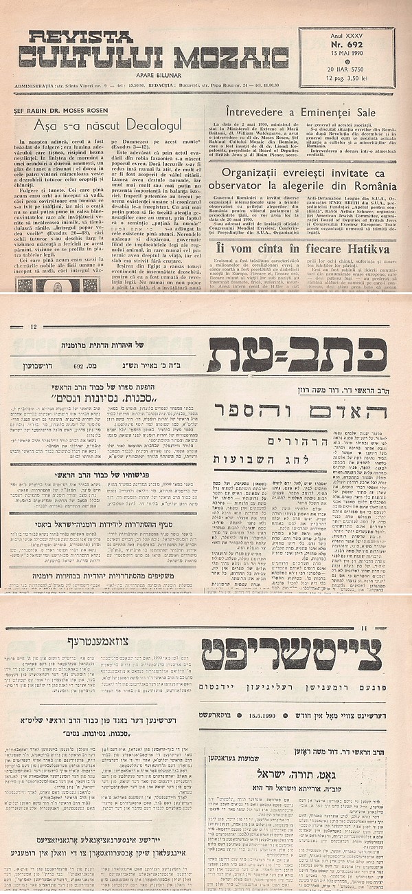 Газета «Ревиста култулуй мозаик». Заглавные страницы разделов на румынском языке, на иврите и на идиш. Выпуск от 15 мая 1990 г., Бухарест.