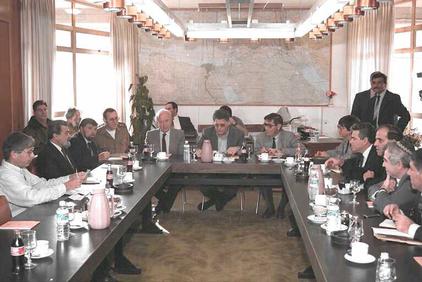 Заседание комиссии Кнесета по иностранным делам и обороне во главе с У. Ором и премьер-министром И. Рабином (26 января 1993 г.). Фото Я. Са‘ара. Государственное бюро печати. Израиль.