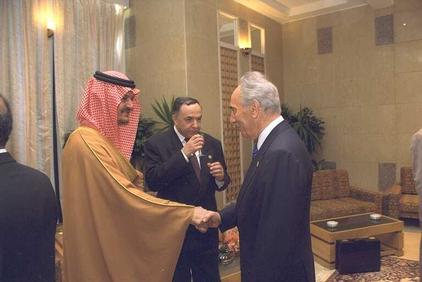 Премьер-министр Израиля Ш. Перес (справа) обменивается рукопожатием с министром иностранных дел Саудовской Аравии принцем С. Ал-Фейсалом во время миротворческой конференции в Шарм-аш-Шейхе, Египет (13 марта 1996 г.). Фото А. Охайона. Государственное бюро печати. Израиль.