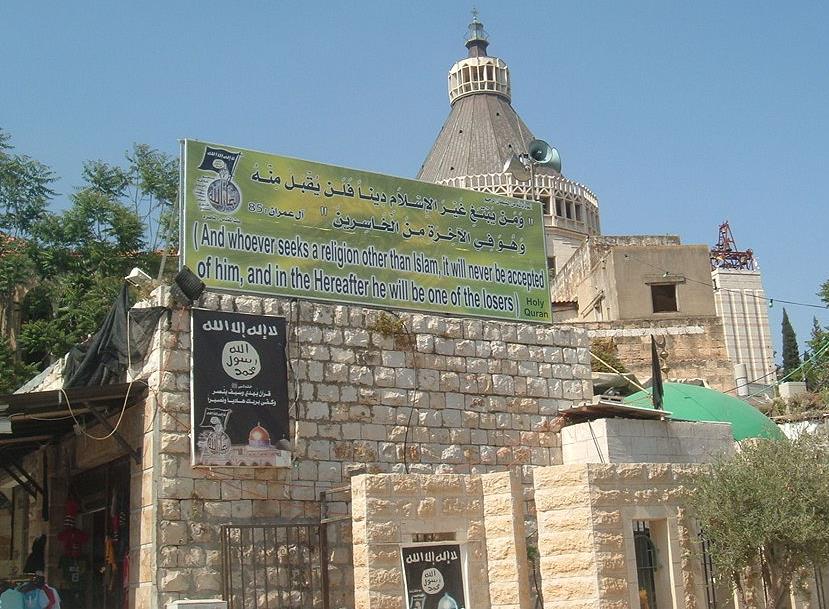 "Спорная мечеть" и базилика Благовещения. Цитата из Корана над площадкой напоминает последователям всех религий, кроме ислама, что они поставили не на ту лошадь.