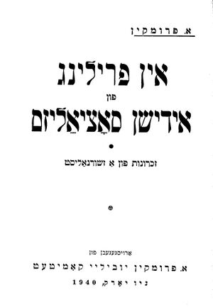 - ↑ פרומקין אברהם. אין פרילינג פון ייִדישן סאָציאַליזם. ניו-יאָרק, 1940. - Фрумкин Авраам. Ин фрилинг фун идишн социализм (Весной еврейского социализма). Нью-Йорк, 1940.