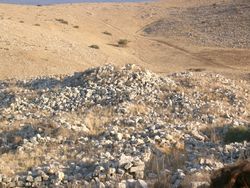 Остатки римского лагеря хорошо просматриваются слева от грунтовки, после начала ее спуска к долине Иордана.