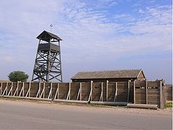 Базовым элементом такого поселения был двор, огражденный двойной деревянной стеной; в пространство между наружной и внутренней стенами засыпался гравий. С внешней стороны стена опутывалась колючей проволокой. В центре двора сооружалась сторожевая вышка, снабженная электрогенератором и мощным прожектором. Жилища поселенцев располагались по углам двора.