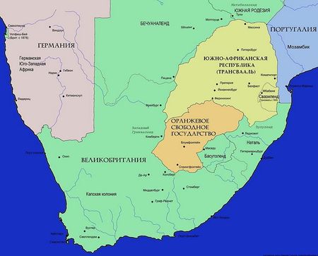 Купив немецкое оружие и рассчитывая на германскую поддержку, власти двух бурских колоний — Оранжевой реки и Трансвааля — провозгласили независимые республики. Британские власти практически не отреагировали. Тогда бурская армия оккупировала колонию Наталь, отделявшую их территорию от Индийского океана и заселённую преимущественно британскими колонистами. В результате произошла Англо-бурская война (1899—1902 гг.),[3] в которой впервые появились характерные моменты европейских войн XX века: убийства обеими сторонами мирных жителей, интернирование враждебного населения в концентрационных лагерях, партизанские действия в тылу врага. Ненависть и обида на Великобританию стали одной из главных частей бурского национализма.