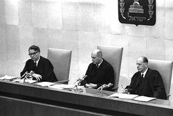 Тем самым фактически была определена система назначения судей, в соответствии с которой за министром юстиции, подобно лорд-канцлеру в Англии, сохранялось решающее слово в этом вопросе. На основании этой системы в июле того же года были назначены первые пять членов Верховного суда. Еще двое судей были назначены правительством в декабре 1949 г. и в мае 1950 г. по совместной инициативе Верховного суда и министра юстиции и после одобрения их кандидатур Кнесетом. Судьи более низких инстанций до 1953 г. назначались только министром юстиции, но он по своей инициативе стал обсуждать кандидатуры судей с членами комиссии во главе с председателем Верховного суда.